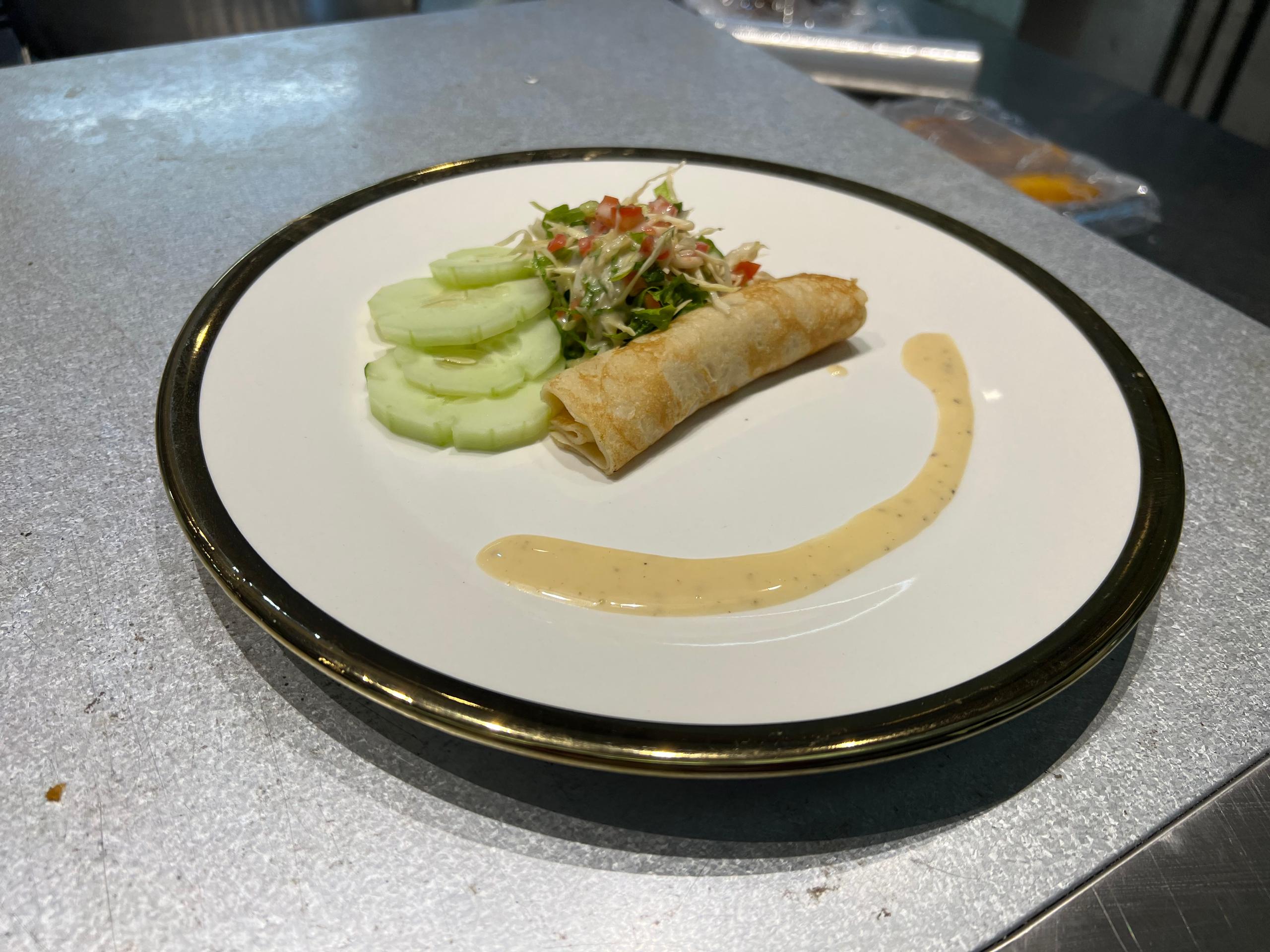 Effiloché de capitaine, roulé dans une galette de manioc, oignons marinés, salade et mayonnaise maison au curcuma